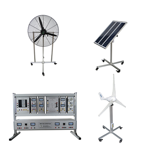 ZM2121 Wind Power And Solar Power Generation Training Equipment Renewable Training Equipment I. Equipment Overview 1 Introduction 1.1 Overview This training system simulate demo wind and solar generate electricity process, enable students to learn wind and solar generate electricity. Wind driven generator is driven by fan, solar energy panel is driven by high work power metal halide. This trainer cultivate students hand on ability, it’s suitable for engineering university, training institute, technical schools. 1.2 Feature (1)This trainer use aluminum column structure, with inner integrated measurement meters, there is universal wheels at the bottom, it’s easy to move. (2) It can do many experiment circuit and components, students can combine them to different circuit, do different experiments and training content. (3) Training workbench with safety protection system. 2. Performance parameter (1) Wind power generation set: wind power generation is consisted of fan unit and air-blower unit, it adopts aluminum profile structure, the bottom of equipment is with universal wheels, the boundary dimension of fan unit is 800mm*800mm*1500mm(length× width× height), the boundary dimension of air-blower is 800mm*800mm*1500mm(length× width× height). (2) Solar power generation device: full aluminum structure, adjustable photovoltaic panel, boundary dimension is 800mm*800mm*1200mm(length× width× height). (3) Power box unit: aluminum profile structure, aluminum hanging box , boundary dimension 1080mm ×300mm×740mm(length× width× height). (4) Single solar energy cell plate: Rated peak value work power: 20Wp Short circuit current:1.9A Peak value current:1.7A Open circuit voltage:18.5V (5) Fan technical specifications: Fan type: horizontal direction toward Start speed: 2.5 meters/second Rated fan speed:10 meters/second Maximum anti wind speed:40meter/second Rated work power: 200-500W Wind direction adjust: auto adjust (6) Battery technical specification: Voltage:12V Volume:12Ah Battery lost electricity:10V±1V Executive standard: GB/T 9535 Relative humidity: 35~85%RH(Non-condensate) (7) Work condition: Temperature-10~+40℃ Temperature≤80℃ Environment air: no corrosivity air, no fuel air, no large quantity of conductive dust (8) Power: Consumption: ≤5000W, Work power: AC220±5%, DC12V/24V Work mode: continuous Power supply: connect in series or in parallel Work mode: continuously 3. System introduction This system is consisted of four parts: wind power system, photovoltaic power generation system, control system and inverter system. The wind power system is consisted of air-blower, generator and battery. Photovoltaic power system is consisted of photovoltaic cell panel and battery. Control system is made up of wind and solar power generation controller. Inverter system is made up of frequency inverter and load unit. Simulative wind power generator, this system adopts horizontal shaft permanent magnet synchronous generator, it adopts air-blower to simulate natural wind, air-blower can select three wind speed, this system can simulate the change of wind direction and wind power through changing the speed and location of air-blower, then it can detect the generation effect under the corresponding condition. Simulation wind power generator is as shown below. Simulation wind power generator As shown above, the left picture is wind power generator, the wind power generator output is three phases AC 12V, output terminal connect to the connection box which located in the underneath of equipment. Right picture is air-blower unit, its power supply is single phase AC 220V,50Hz, when it working, connect the pedestal of two portion together through profile connecting rod. As shown below. Connecting mode of simulation wind power generator 2. Simulative photovoltaic power generation system: this system adopts three pieces of 18V,20W solar panel, it can carry out series and parallel connection according to different system voltage, it can simulate the sunlight location through adjusting the relative location with photovoltaic panel, then it’s easy to simulate demonstration of various sunlight condition. Simulation photovoltaic power generator as shown below. The output of photovoltaic cell panel connect to connecting box which located in the rear of device, output it through safety terminal. The rated output voltage of single block photovoltaic cell panel is 18V, three pieces of cell panel can operate individual, and it also can operate in parallel. Simulation photovoltaic power generator 3. Battery set: it is consist of two pieces of 12V/12AH maintenance-free no-service battery, it also can connect in parallel as 12V200AH system, it also can connect in series as 24V/100AH system, it can enhance the understanding of battery series and parallel connection. Battery integrated in the internal of power box, battery output terminal connect to power box panel. In the picture, 1 and 2 are the battery output portion, it output through red and black terminal.